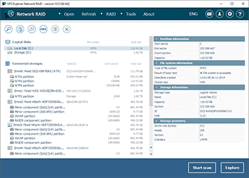 UFS Explorer Network RAID permite recuperar archivos perdidos de dispositivos NAS de fabricantes populares, como Drobo, Buffalo Technology (TeraStation, LinkStation), Synology, QNAP Systems y otros. La utilidad detecta los metadatos RAID en las unidades NAS y emplea ellos para automáticamente ensamblar la matriz. La última también se puede ensamblar manualmente en modo virtual con la ayuda del Constructor de RAID ajustable.