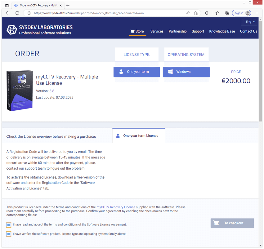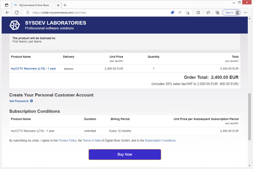 To submit your order, press the "Buy license" button available on the myCCTV Recovery – One-Time Use License webpage in the Software Store.