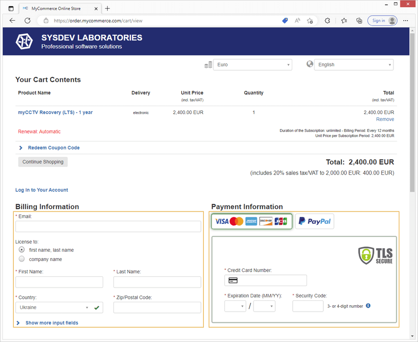 Verify the product one more time in your shopping cart and complete the billing form. Choose the desired payment method, currency and provide the information necessary for the purchase: the first and the last name, email and address.